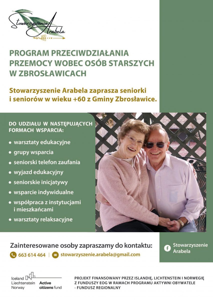 Zapraszamy do uczestnictwa w projekcie pn.: Program przeciwdziałania przemocy wobec osób starszych w Zbrosławicach. Stowarzyszenie Arabela otrzymało dotację na realizację projektu „Program przeciwdziałania przemocy wobec osób starszych w Zbrosławicach” realizowanego z dotacji programu Aktywni Obywatele – Fundusz Regionalny, finansowanego z Funduszy EOG. Celem projektu jest przeciwdziałanie przemocy wśród seniorów w gminie Zbrosławice. Odbiorcami projektu będą:…